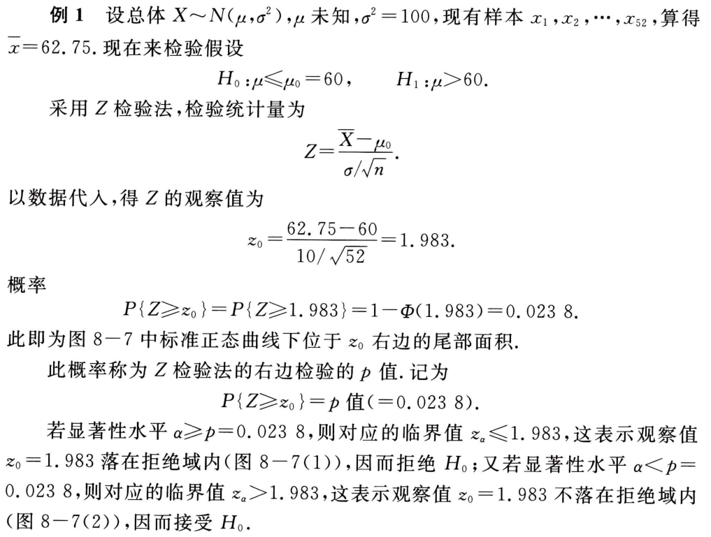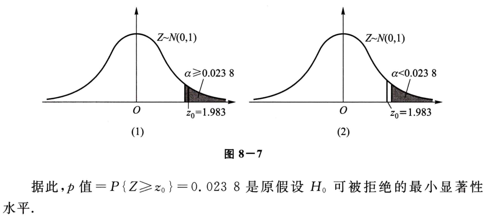 假设检验问题的 p 值是由检验统计量的样本观察值得出的原假设可被拒绝的最小显著性水平。若 p≤α ,则拒绝 H0 ,否则接受 H0 。